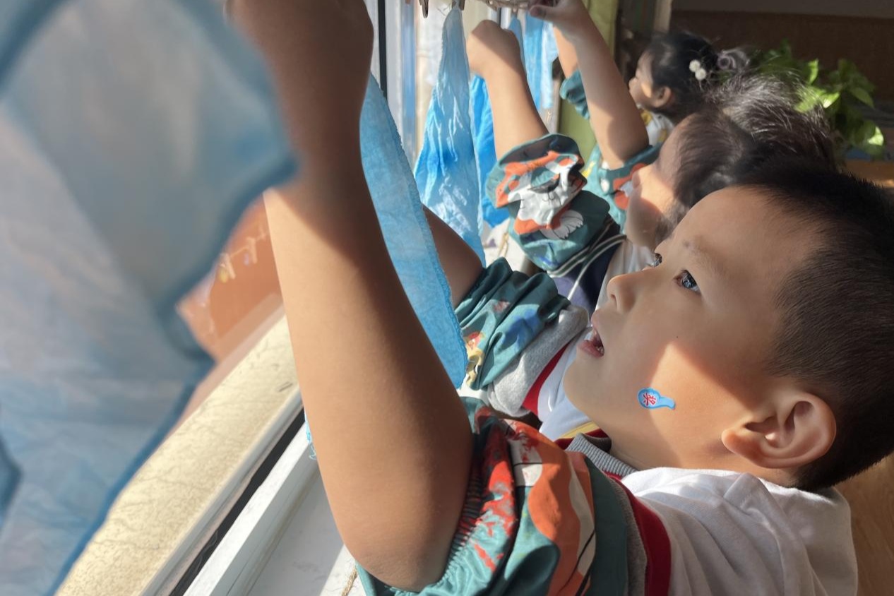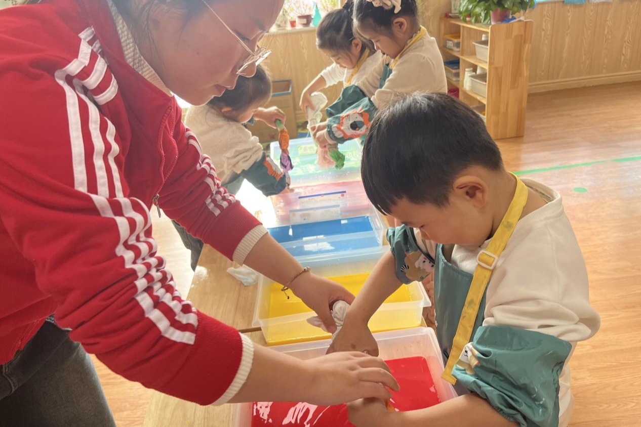 省安平县长儿园建材街园推出“扎染非遗”进校园勾当,正在教员的指点下,